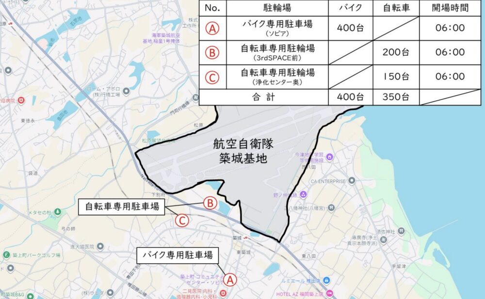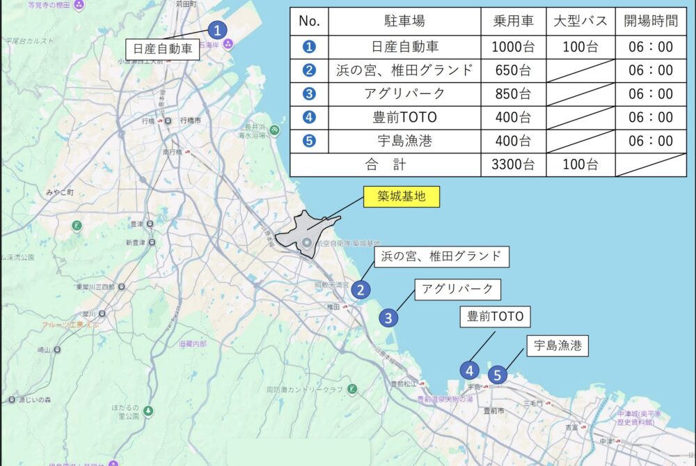 築城基地周辺には臨時駐車場がいくつか設けられる予定ですが、毎年早朝から満車になることも少なくありません。